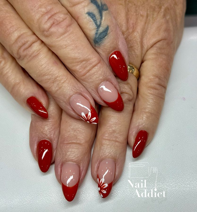 This look blends bright red French tips with a natural base and delicate white floral art. The design is feminine and fresh, giving classic French tips a stylish upgrade with soft floral detailing.