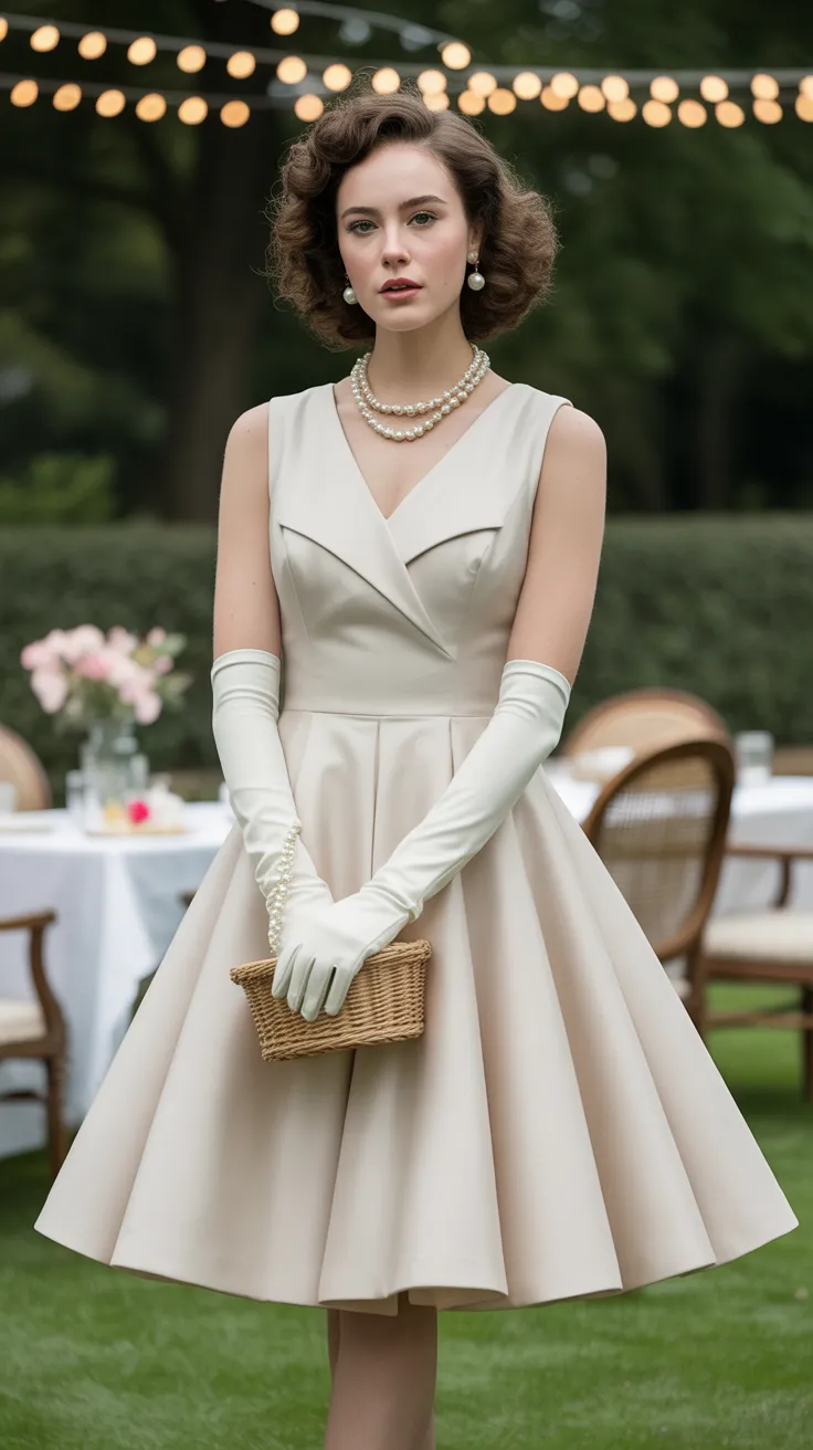Paired with a classic pearl necklace, this outfit embodies retro glam. The pearls add a touch of sophistication, making it perfect for special occasions or a night out. This retro glamour dress to impress is all about elegance and charm.