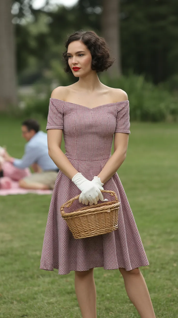Pairing the dress with elegant gloves elevates the look, giving it that retro glamour dress to impress vibe. The gloves add a sophisticated flair, making the outfit suitable for a chic brunch or an evening out. The combination of the gingham pattern and the gloves creates a delightful contrast that embodies a retro glam outfit.