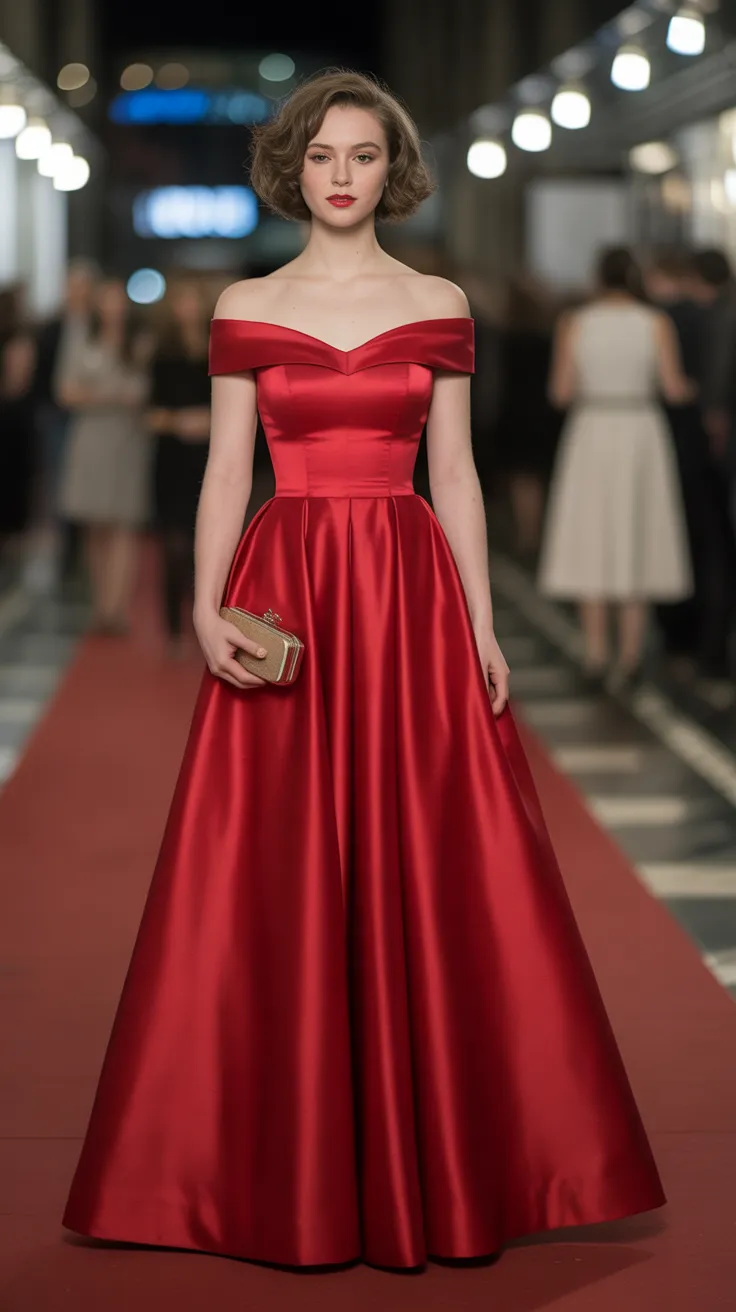 The off-shoulder satin gown is a stunning piece that embodies vintage glam. Its rich red hue instantly draws attention, making it a perfect choice for anyone looking to impress. The smooth satin fabric drapes beautifully, enhancing the silhouette and adding a touch of luxury.