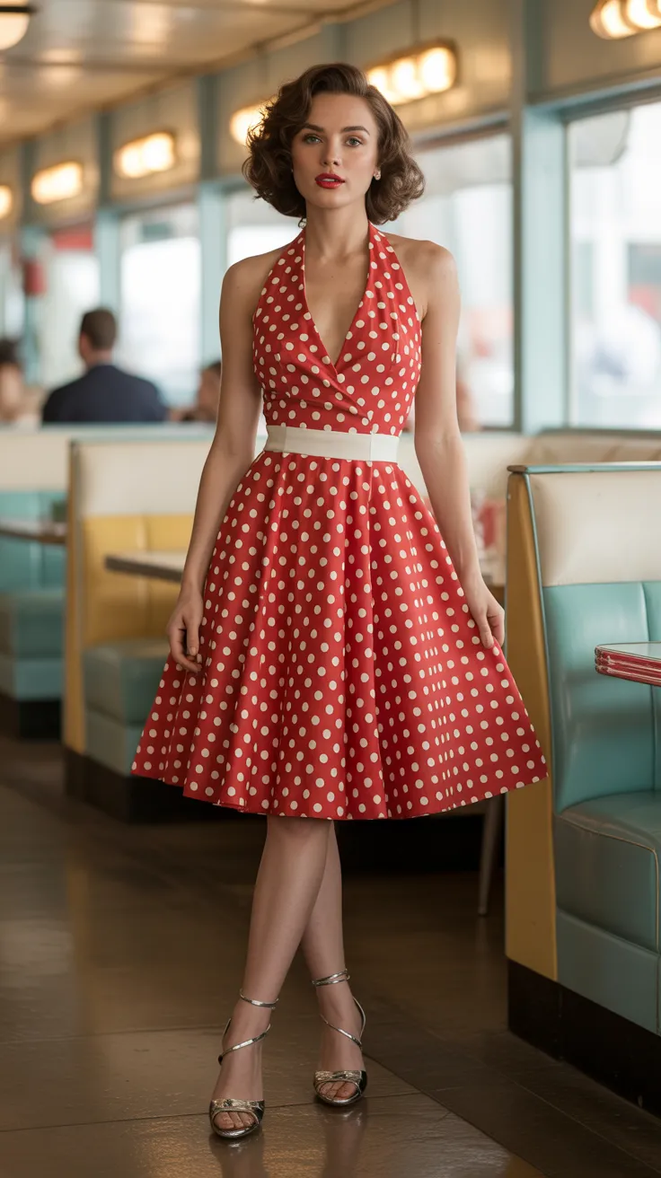 The polka dot halter dress is a classic piece that embodies vintage glam. Its playful pattern and flared skirt create a fun yet sophisticated look. This dress is perfect for anyone wanting to channel that retro glamour dress to impress vibe.