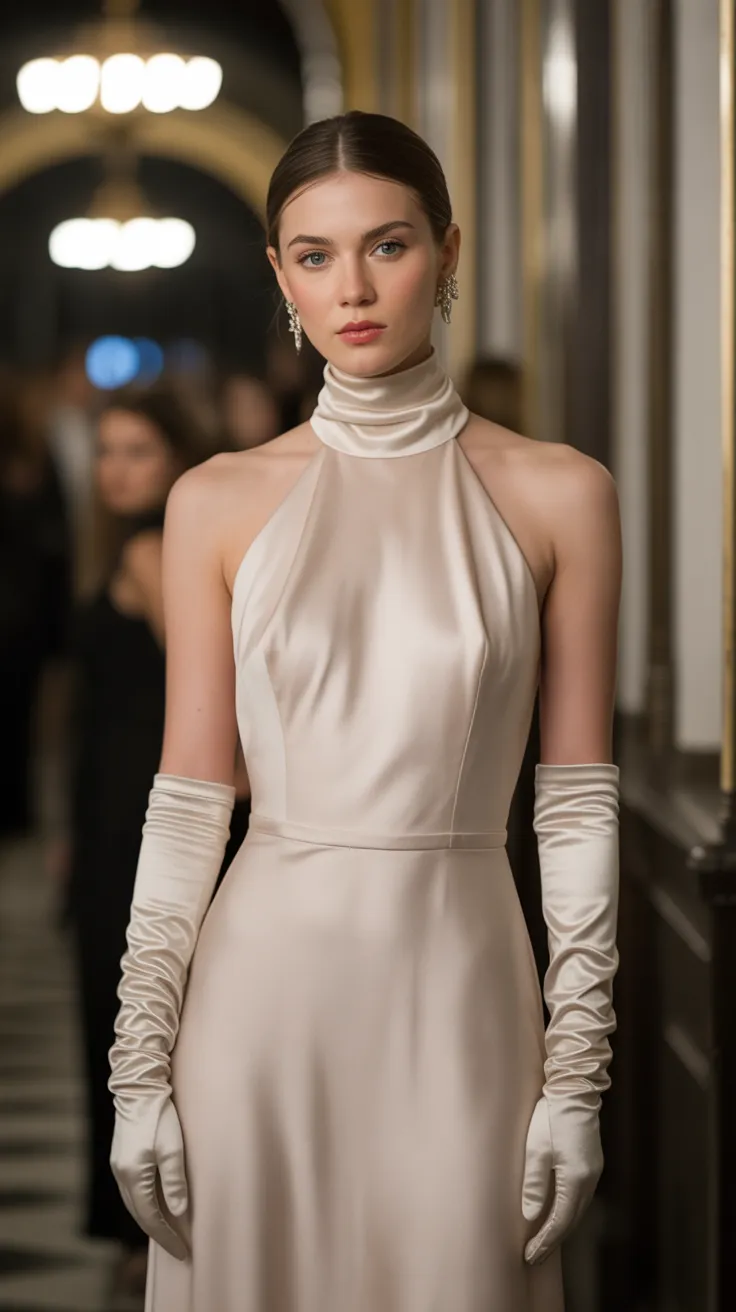 7. High-Neck Column Dress With Satin Gloves