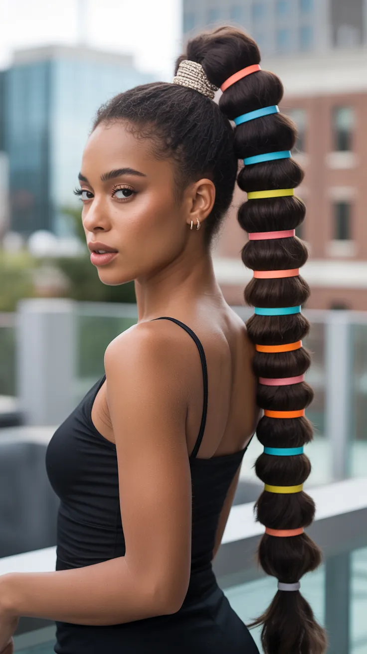 The ponytail is elevated, giving it a sleek appearance, while the curls cascading down add a touch of flair. The rubber bands not only serve a functional purpose but also enhance the overall design, creating a unique visual appeal.