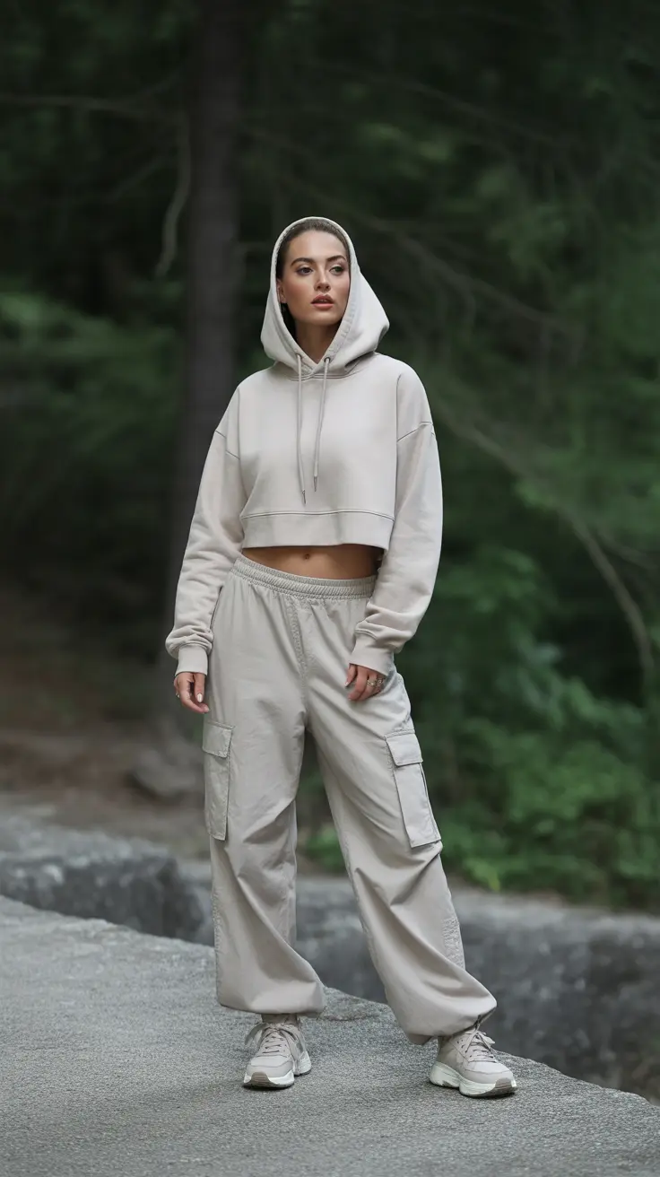 This outfit perfectly blends comfort and style for those who love the outdoors. The cropped hoodie adds a relaxed vibe, making it great for summer camping outfits. It’s cozy enough for chilly evenings around the campfire yet stylish enough to wear during the day.