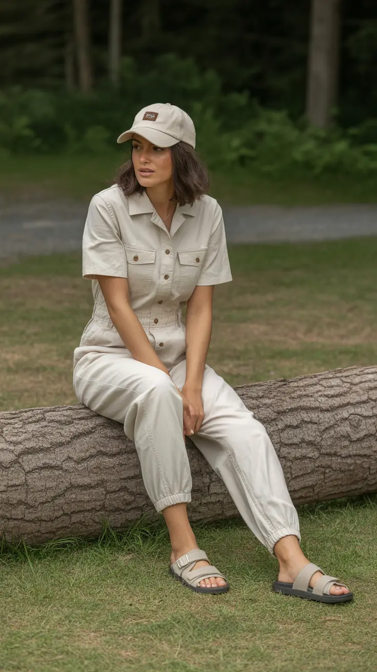 This outfit perfectly blends comfort and style, making it a go-to for anyone who loves nature-inspired fashion. The cotton jumpsuit is lightweight and breathable, ideal for warm days spent outdoors. Its earthy tone complements the natural surroundings, giving off those salty granola vibes.