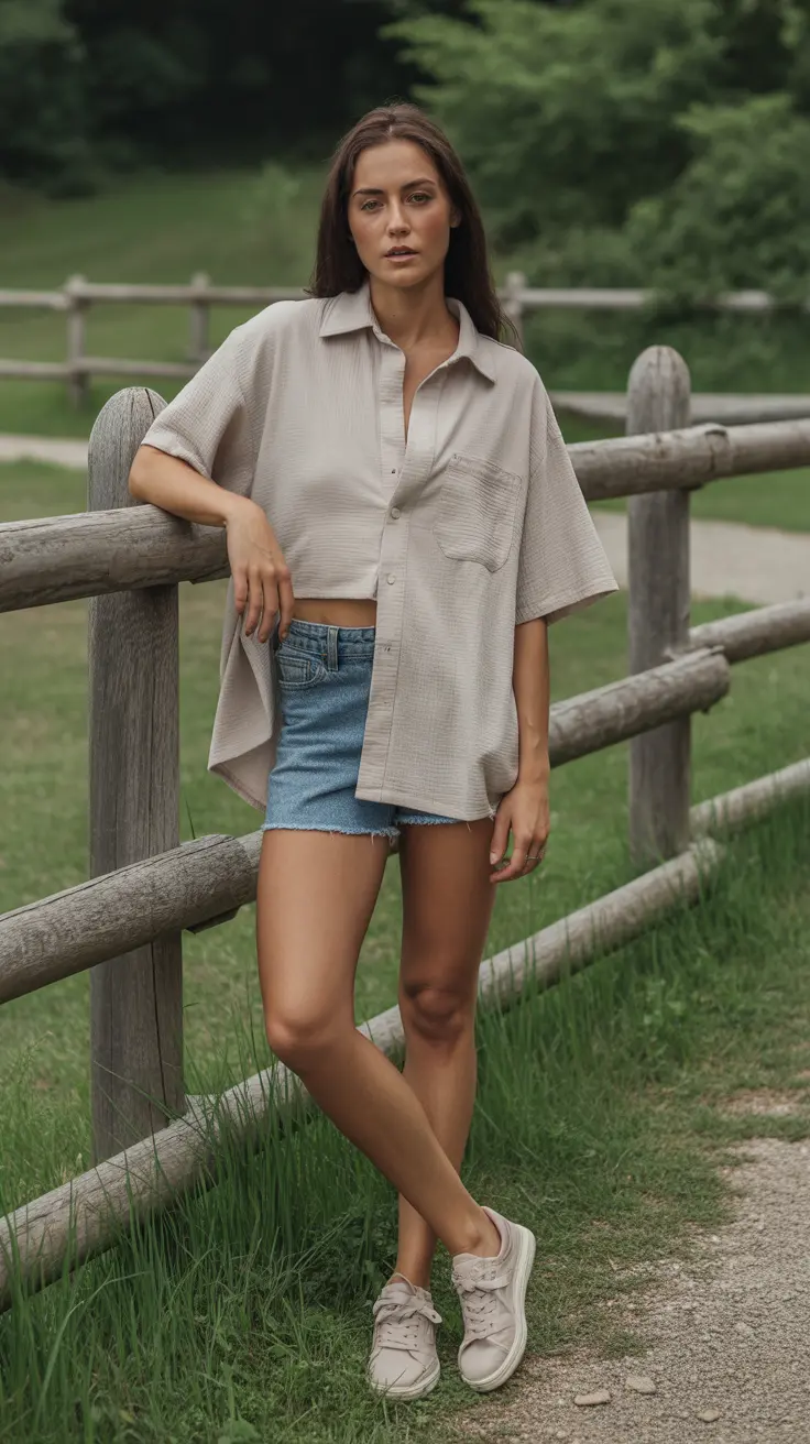 Denim shorts paired with an oversized henley create a perfect blend of comfort and style. This outfit is ideal for those sunny days when you want to feel relaxed yet put together.