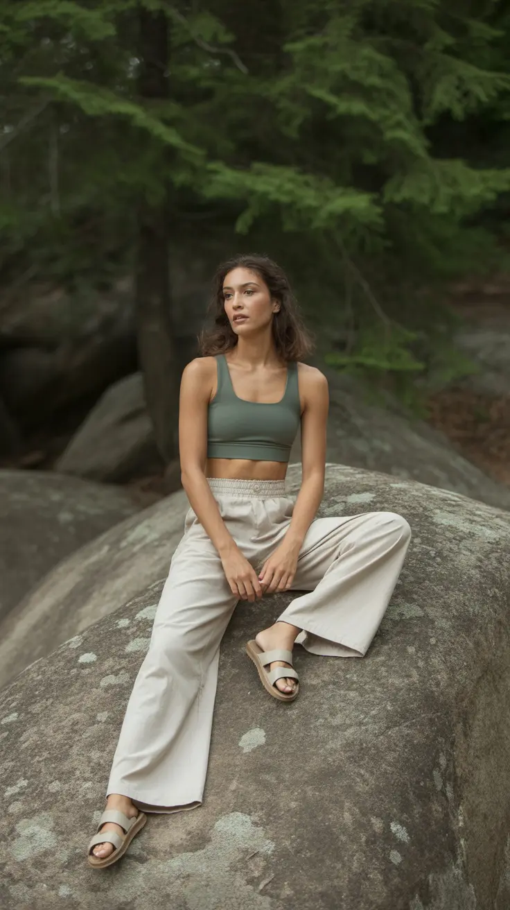 The light fabric of the pants allows for easy movement, making this look suitable for everything from a casual stroll by the lake to summer camping outfits. Pairing the sports bra with wide-leg pants creates a laid-back yet chic ensemble that embodies earthy style.