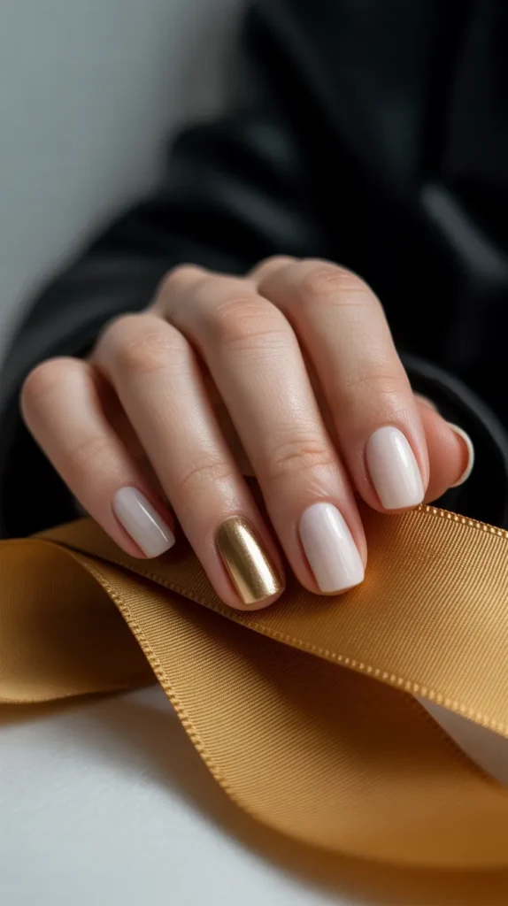 White and gold accent nails combine clean minimalism with festive flair. The contrast of pure white and glimmering gold makes these winter nails short designs look refined yet celebratory. Itβs classy, modern, and 100% December-approved. π€