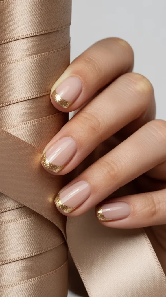 Beige glitter tips bring subtle glamour to your winter nails short collection. The neutral base keeps things refined, while the dusting of gold sparkle adds festive charm. Theyβre understated but eye-catching perfect for everyday wear or elegant evenings. β¨