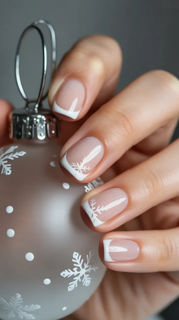 French snowflake tips are where tradition meets winter magic. The soft nude base and white tips make a perfect canvas for delicate snowflake art. These short winter nails bring a polished, seasonal twist to a timeless style. βοΈ