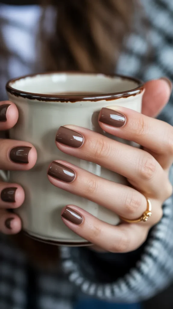 Chocolate mocha nails wrap your short winter nails in cozy warmth. The rich brown tone feels earthy and comforting, perfect for sweater weather days. Itβs refined, seasonal, and beautifully understated. β