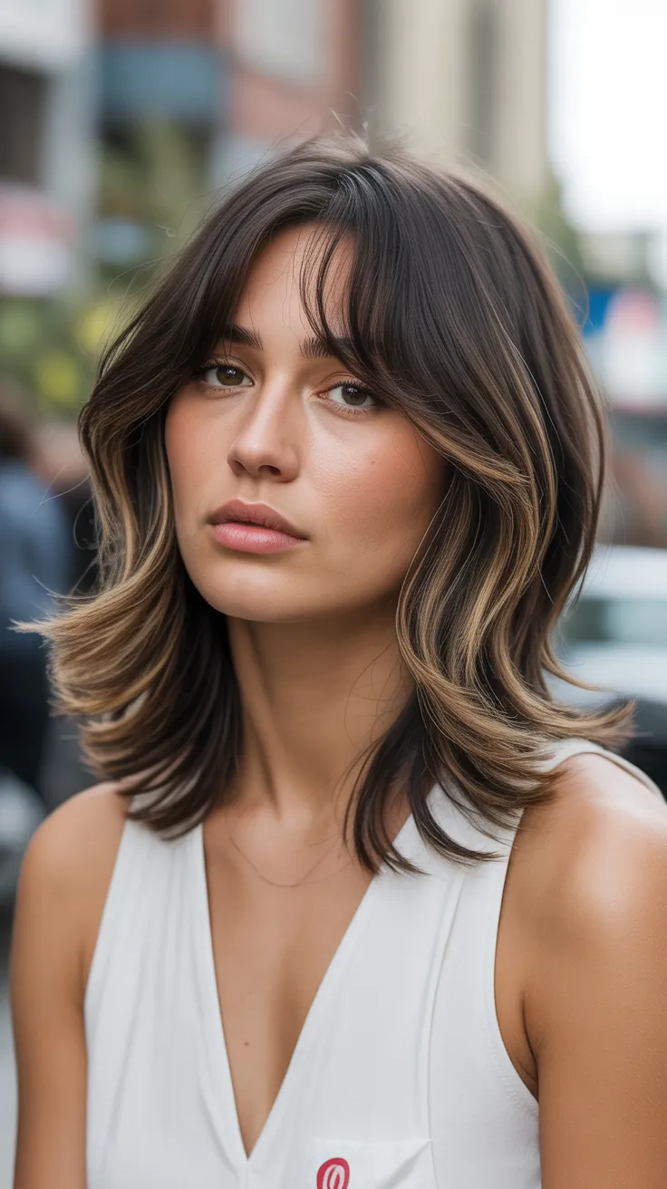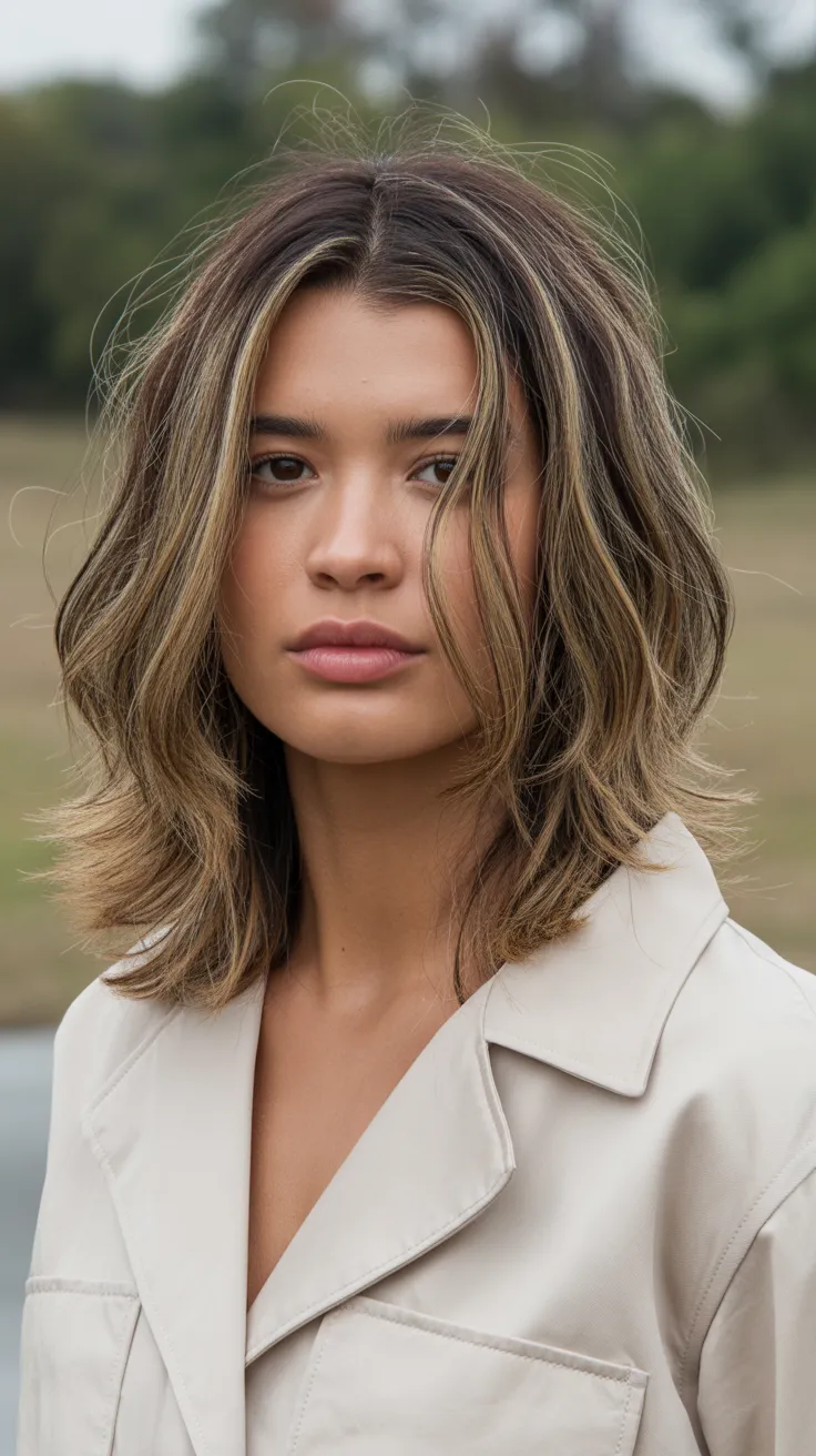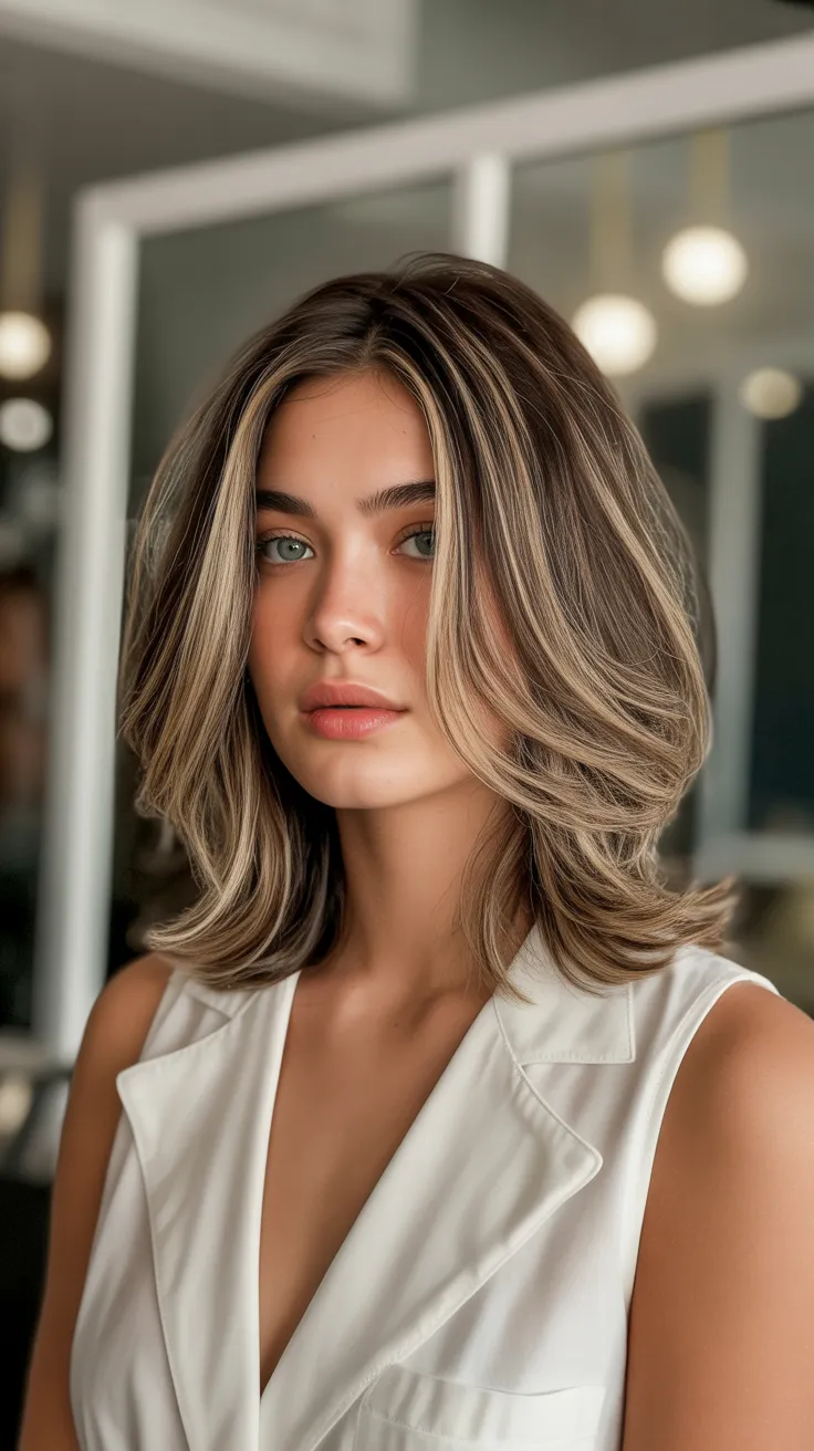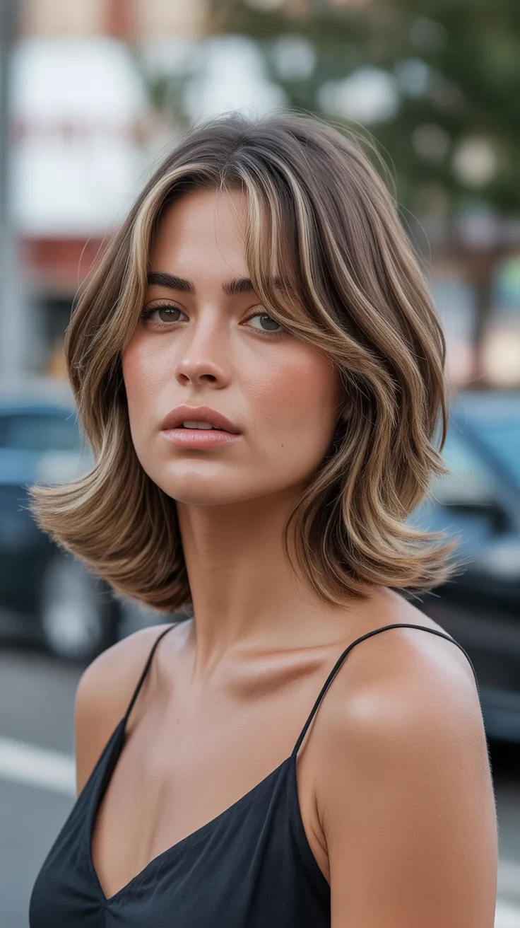 In the image, you can see how the haircut enhances the model’s features, showcasing the natural flow of the hair. The light highlights add dimension, making the overall look even more appealing. This is a great option for anyone considering shoulder length hair cuts that are both chic and easy to maintain.