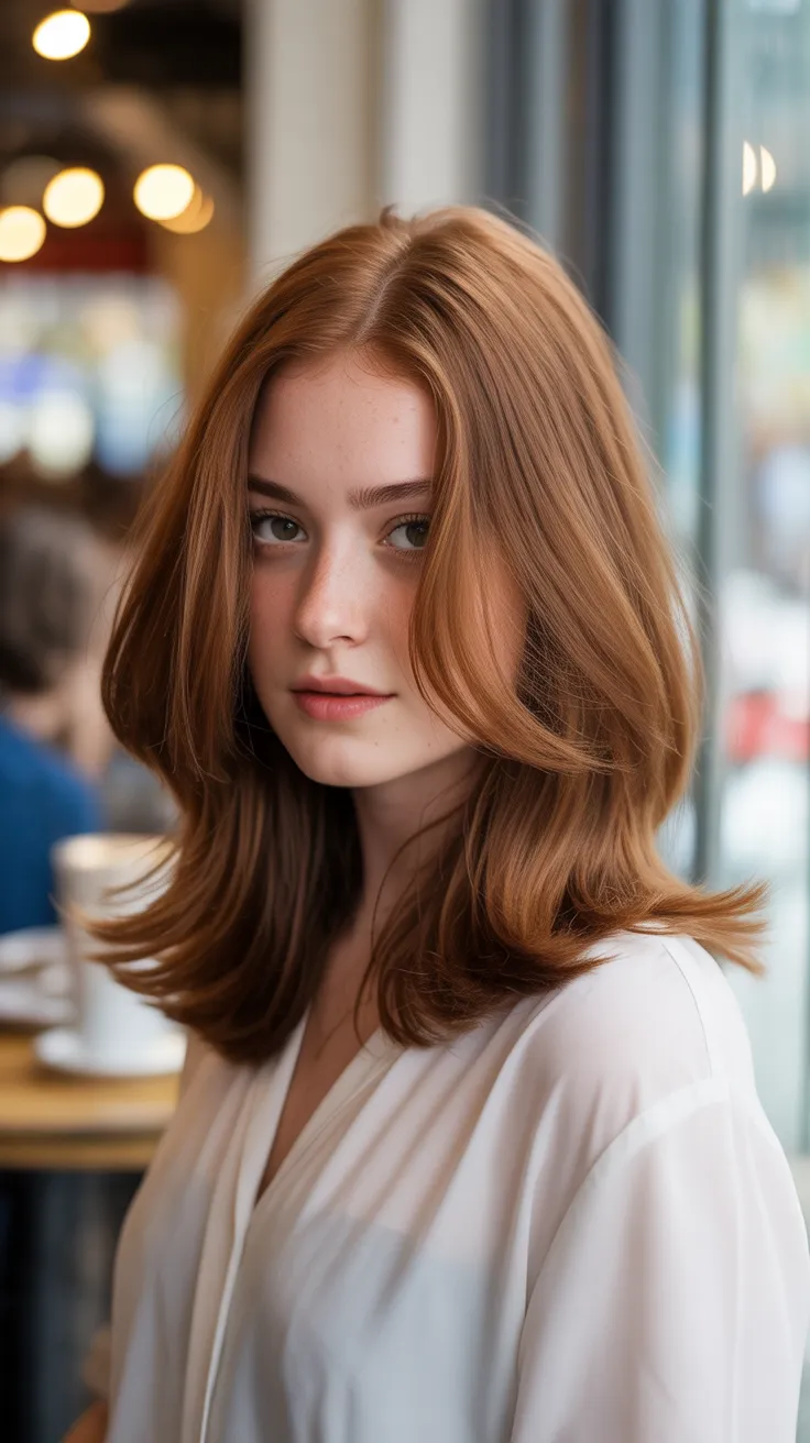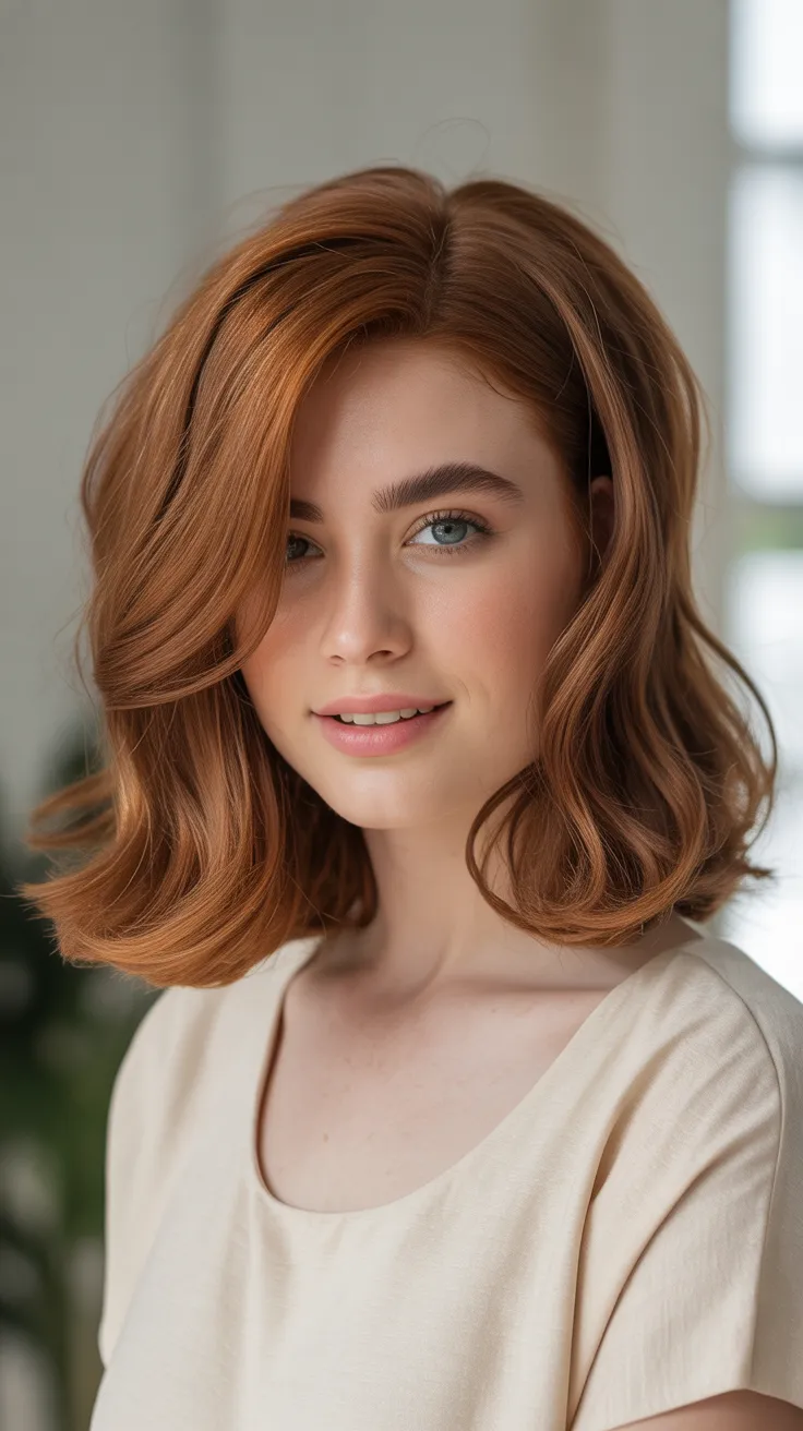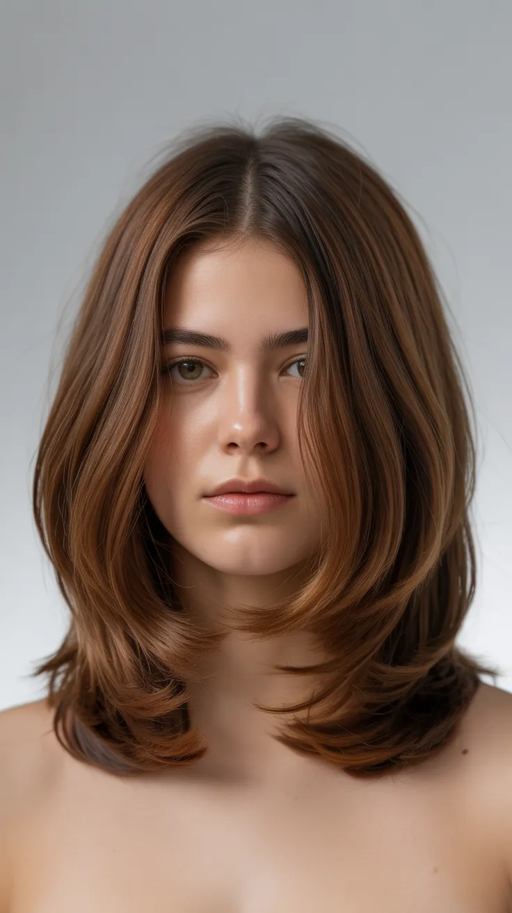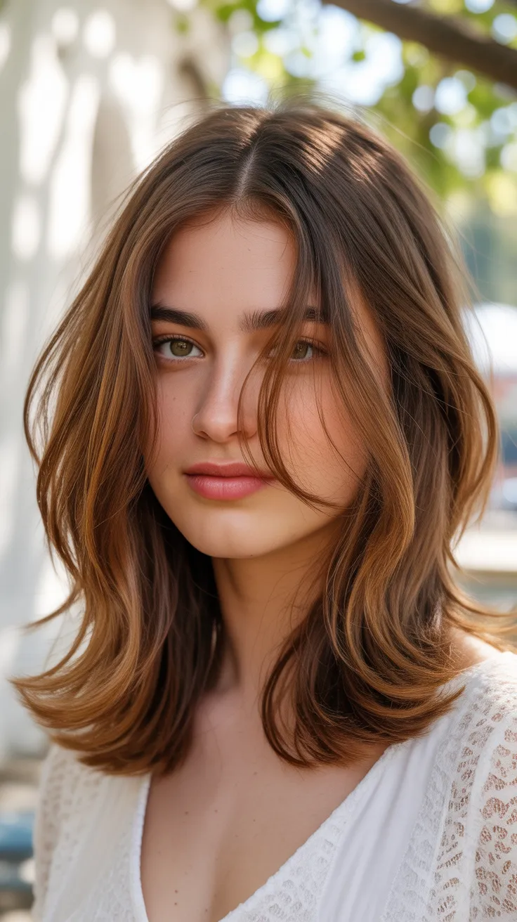 The image showcases a stunning example of this haircut. The hair is cut to a flattering shoulder length, with subtle layers that frame the face beautifully. The warm tones add depth and dimension, making it a perfect option for those wanting a fresh, lively appearance.