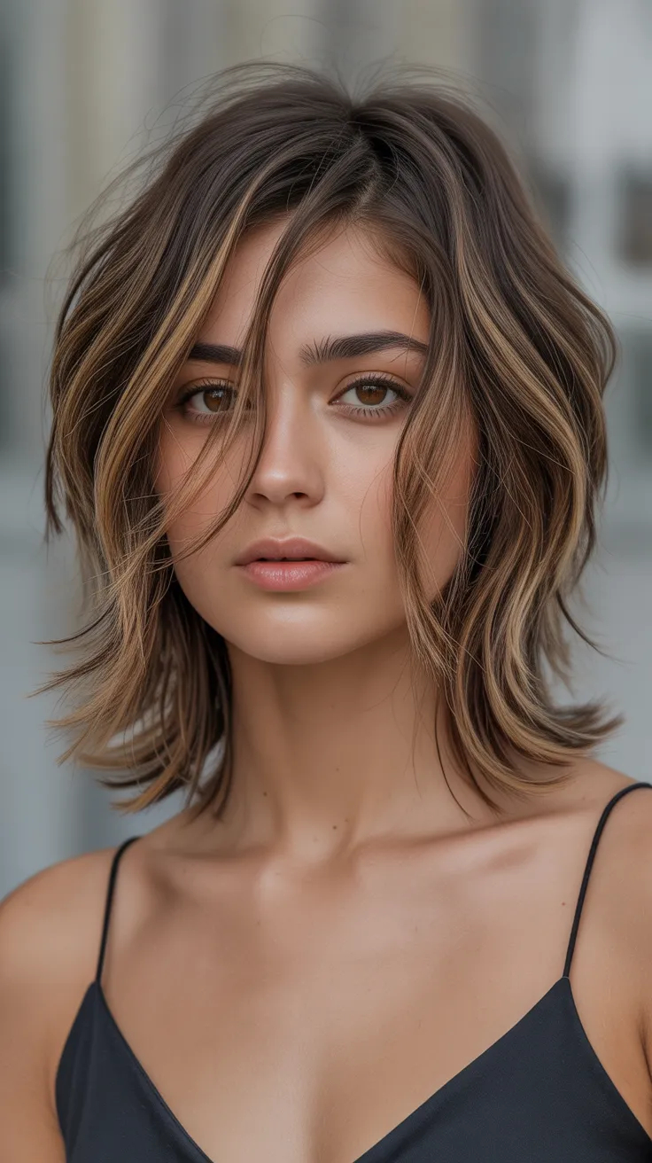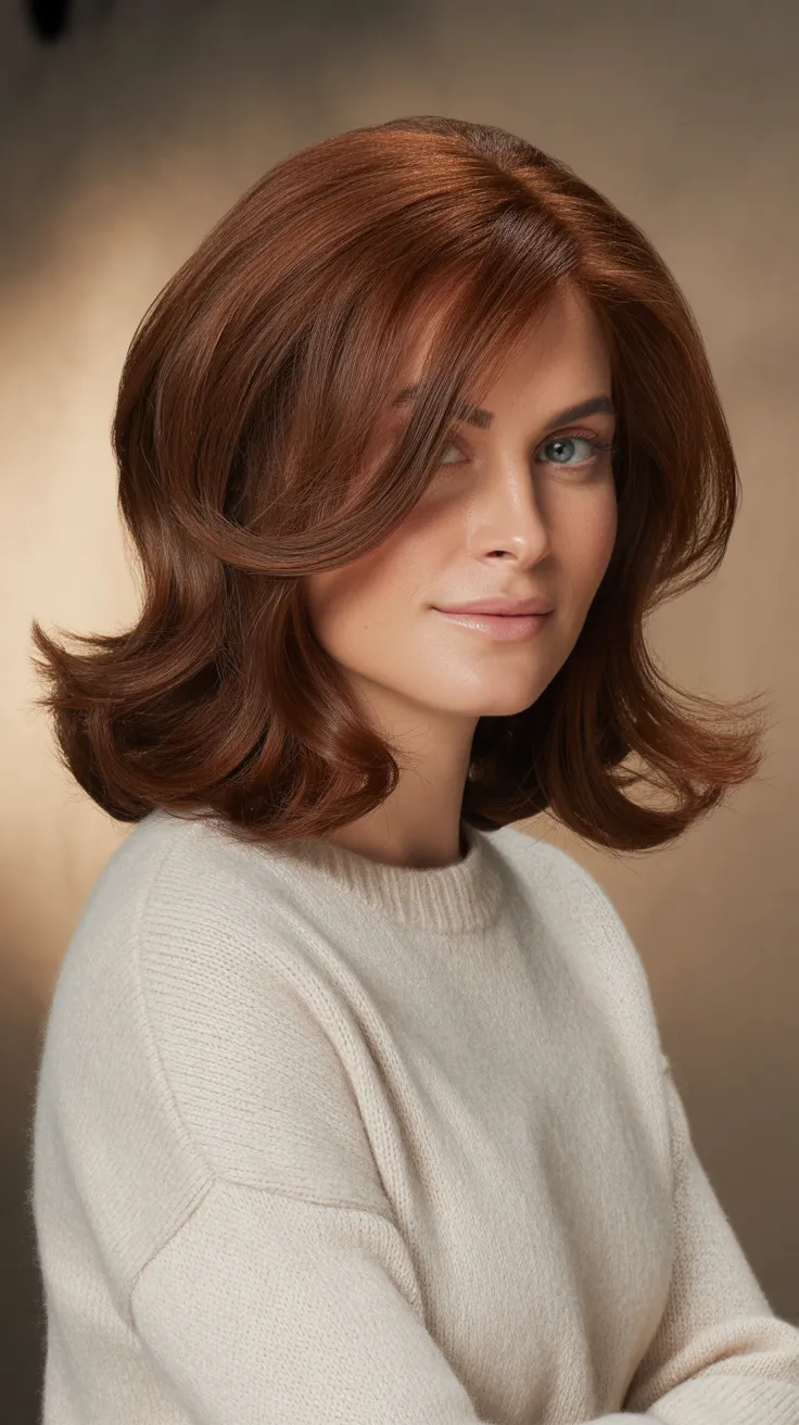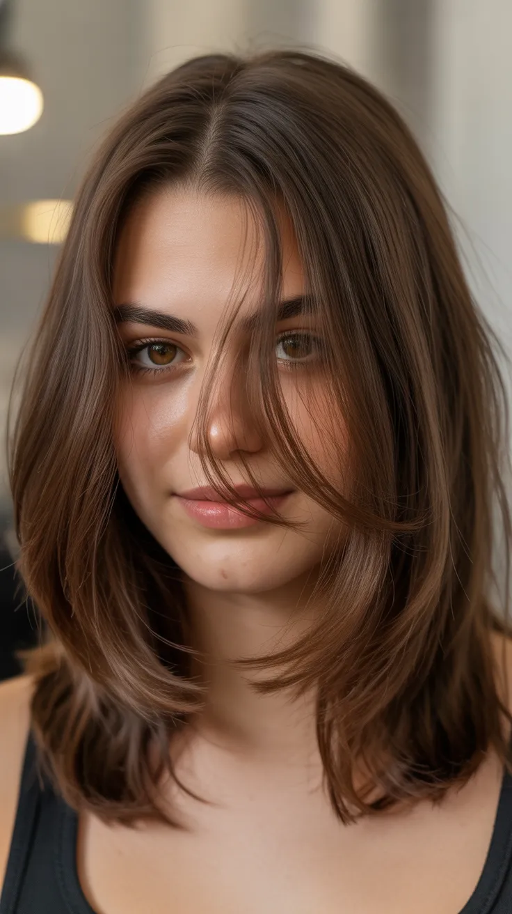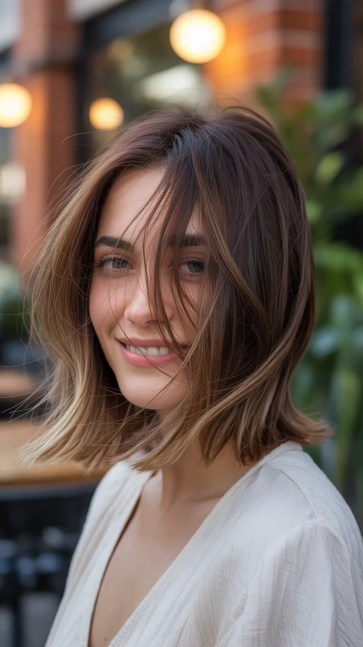 The image showcases a stunning example of this haircut. The hair is cut to a flattering shoulder length, with subtle layers that frame the face beautifully. The warm tones add depth and dimension, making it a perfect option for those wanting a fresh, lively appearance.