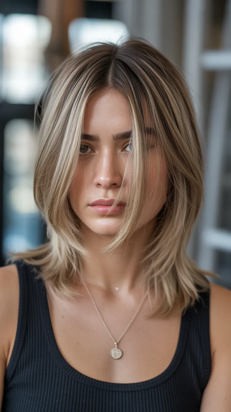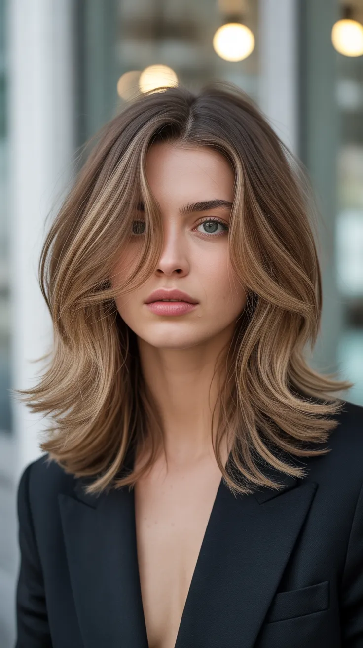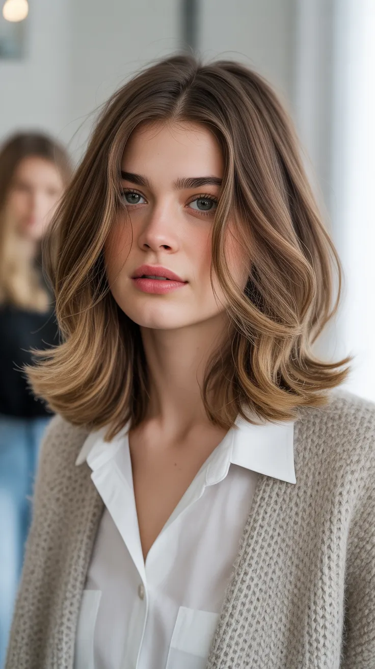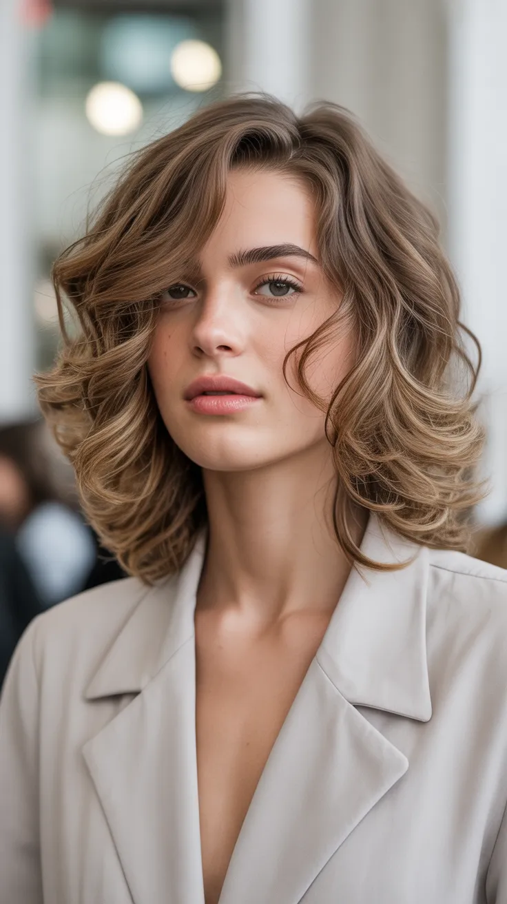 The model in the image showcases this haircut perfectly. Her light, tousled waves create a soft, effortless look. This is ideal for those who want a low-maintenance style that still looks chic. The shoulder-length cut is versatile, allowing for various styling options, from sleek and straight to playful curls.