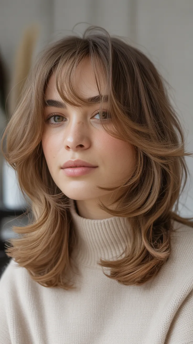 The curtain fringe frames the face beautifully, drawing attention to the eyes and cheekbones. It works well with various hair textures and colors, adding a modern touch to medium layered hair. This cut is perfect for those who want a chic yet low-maintenance option.