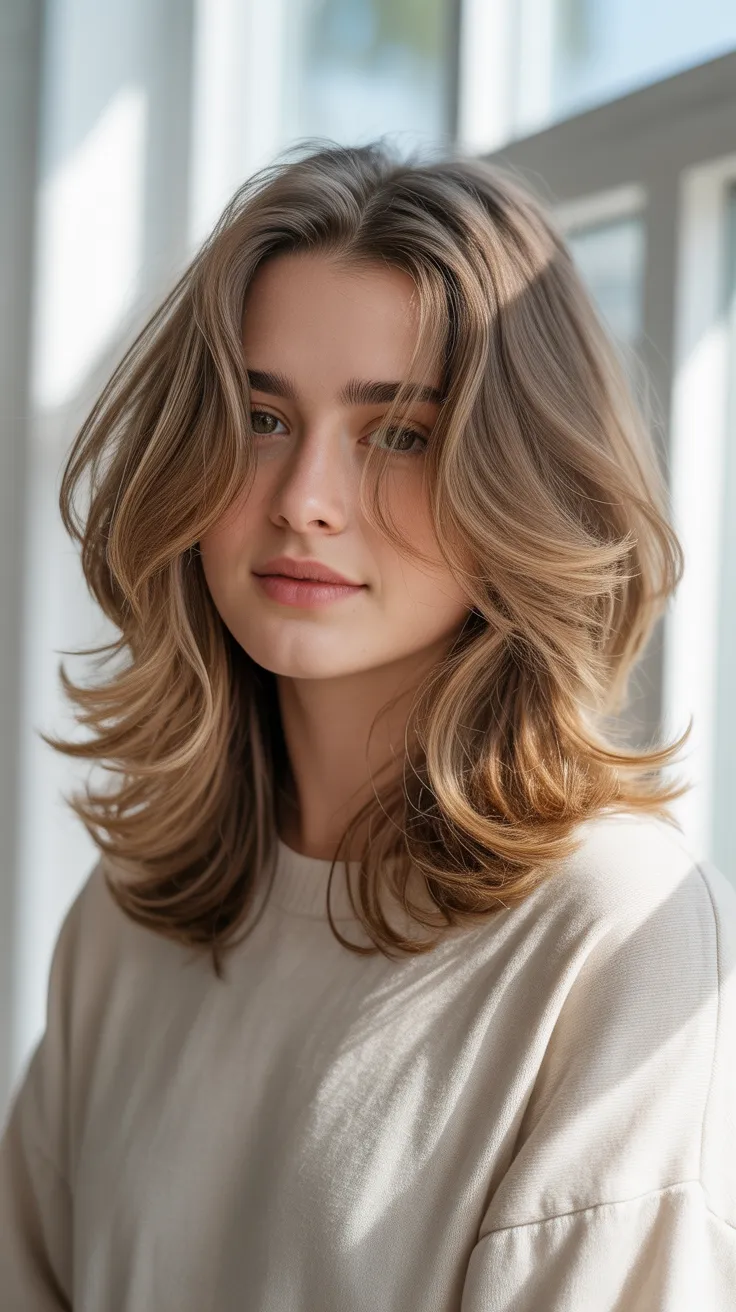 The model’s hair has a soft, air-dried texture that adds to the relaxed feel. This look is easy to achieve, especially for those with medium layered hair. Just let your hair dry naturally after washing, and you’ll get those lovely waves that frame the face perfectly.