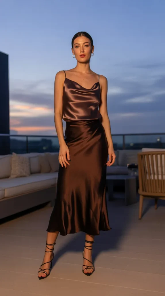 A monochrome moment always feels soft and elevated, especially in warm brown tones. The satin cowl-neck top and silk skirt work together to create a cohesive glow. Strappy flats keep things understated and perfect for daytime. Add subtle gold accessories for a hint of elegance. This outfit is ideal for relaxed dinners or casual get-togethers.