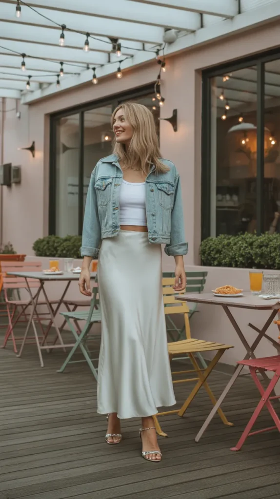 16. White Silk Maxi Skirt with a Cropped Denim Jacket
