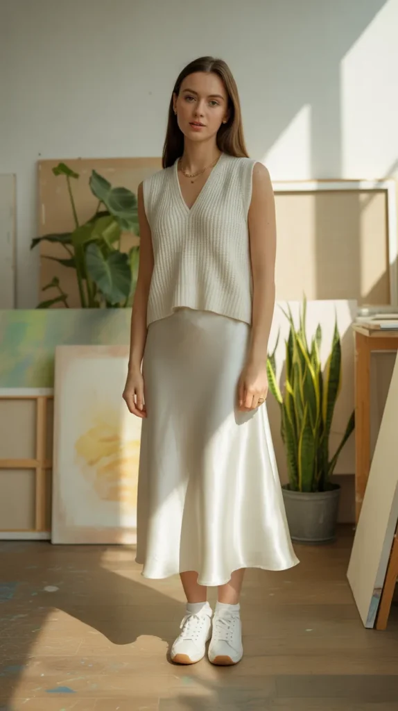 Creamy neutrals always feel calm and stylish, especially when paired with the soft texture of a knit vest. The white silk skirt adds a touch of shine that elevates even the simplest casual outfit. Clean sneakers keep the look wearable and perfect for relaxed, everyday plans. Simple gold jewelry adds just the right amount of polish without doing too much. This combo is ideal for anyone who loves soft, feminine styling.