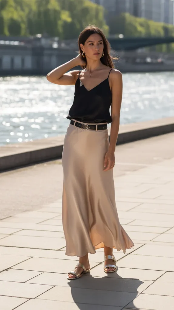 This pairing brings an elongated, classy silhouette that still feels casual enough for daytime wearing. The champagne silk catches the light beautifully, while the black cami keeps things grounded and balanced. A thin belt helps define the waist without distracting from the flow of the skirt. Flat sandals make the overall outfit comfortable and airy. Add a structured crossbody for a refined but easygoing finish.