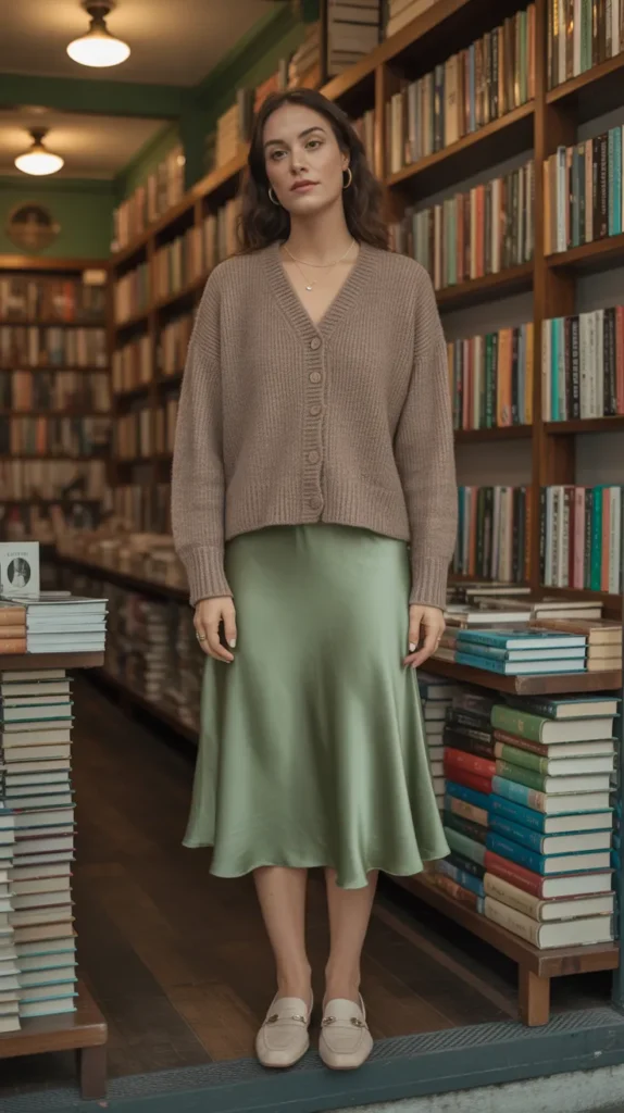 Earthy tones meet soft shine in this cozy-chic look. The bias-cut silk skirt gives beautiful movement while staying comfortable. A soft brown cardigan buttoned as a top adds warmth and a subtle vintage touch. Delicate jewelry keeps everything polished without overdoing it. Pair loafers for a clean daytime finish that’s perfect for work or weekend plans.