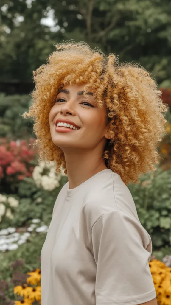 Golden blonde afro curls are bold, radiant, and glow beautifully in fall light ☀️. The golden tones bring warmth, while natural texture makes the look unforgettable. It’s a chic way to experiment with autumn blonde without losing your curl pattern. This is a true hair color for autumn that celebrates texture and warmth. If you want to stand out while staying seasonal, this is the one.
