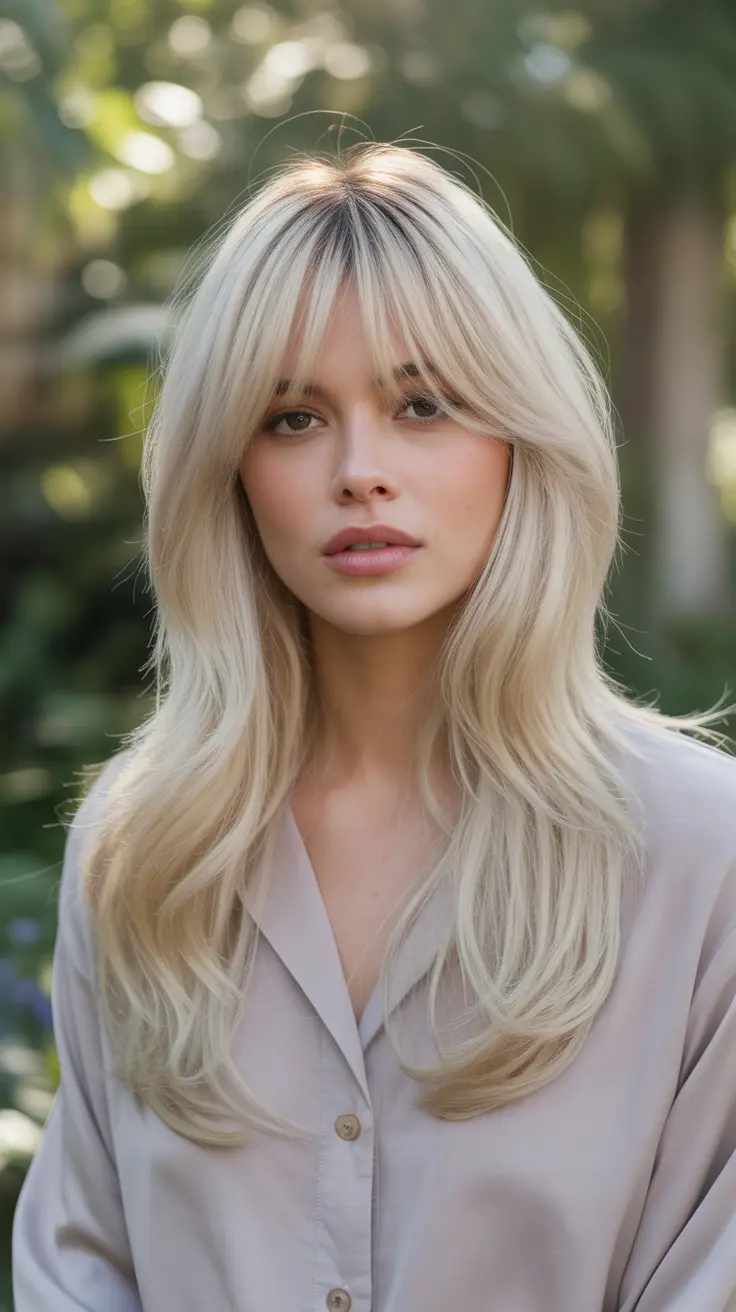 The fringe bangs frame the face beautifully, enhancing the eyes and cheekbones. This hairstyle is not only trendy but also versatile, making it suitable for various occasions. Whether you’re heading to a casual brunch or a night out, this blonde hair inspo will keep you looking fresh and stylish.