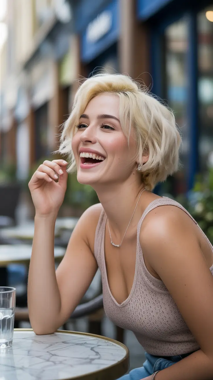 This short messy bob cut is a fantastic way to rock creamy vanilla blonde hair. The tousled layers add a playful vibe, making it perfect for anyone looking for a fun yet chic style. The buttery blonde tones shine through, creating a soft and inviting look.