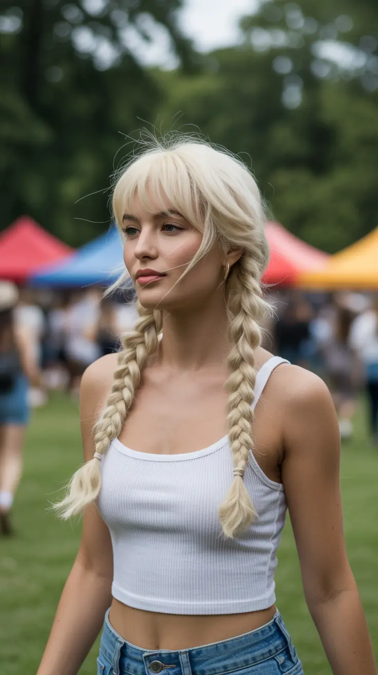 The braided pigtails add a youthful charm, making them a go-to style for anyone wanting to showcase their creamy vanilla blonde hair. This look is not just about the color; it’s about the fun and carefree attitude that comes with it. Pairing the braids with a simple outfit can really let the hair shine.