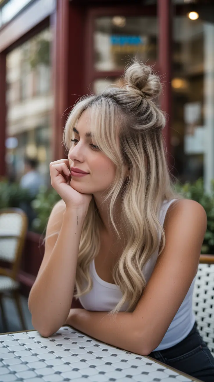 The top knot is not just practical; it adds a chic touch to any outfit. It’s perfect for those busy days when you want to keep your hair off your face while still looking stylish. The effortless look of this hairstyle pairs beautifully with the creamy vanilla blonde hair, making it a go-to for any occasion.