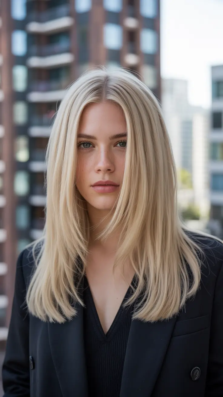 This look features straight, mid-length vanilla blonde hair that radiates a soft, creamy vibe. The middle part adds a touch of symmetry, making it a go-to style for many. The buttery blonde tones blend seamlessly, creating a fresh and modern appearance.