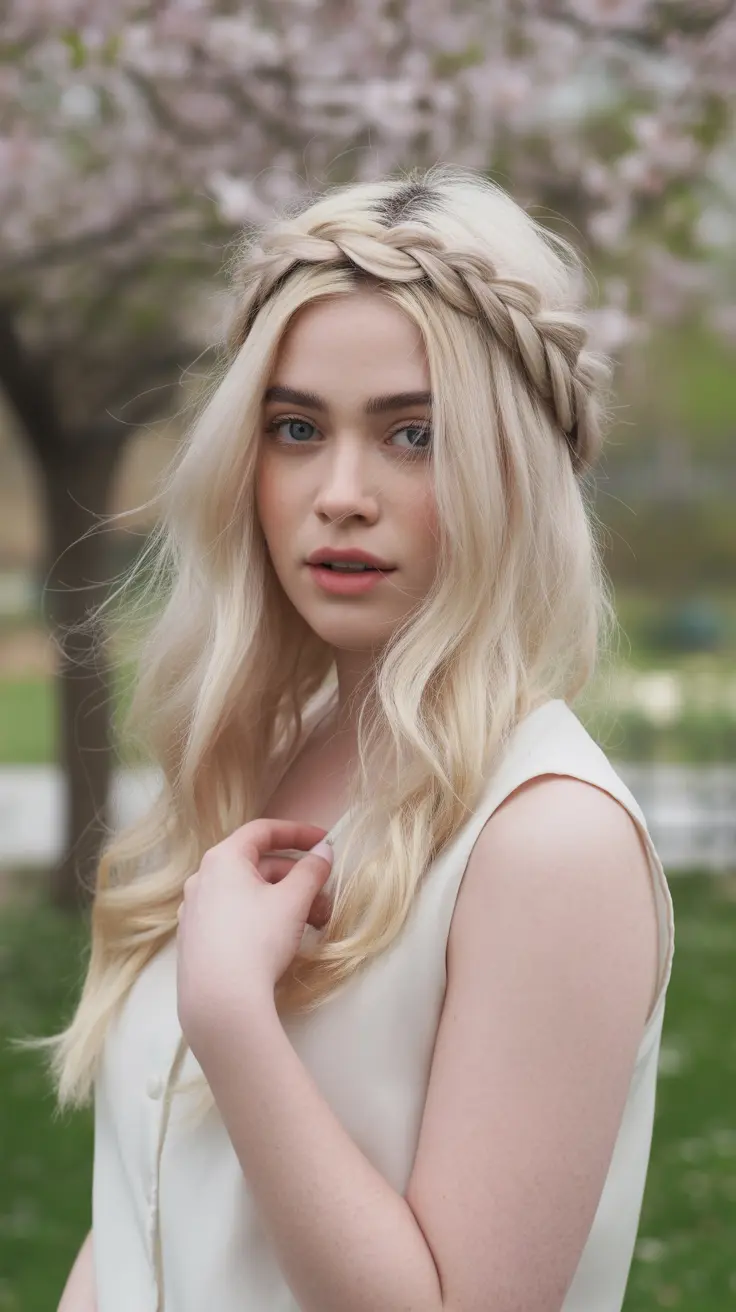 The braided crown beautifully frames the face, enhancing the natural features while showcasing the buttery blonde tones. This hairstyle is not only stylish but also practical, keeping hair out of the way while still looking effortlessly chic. It’s a great way to show off those gorgeous waves that complement vanilla blonde hair perfectly.