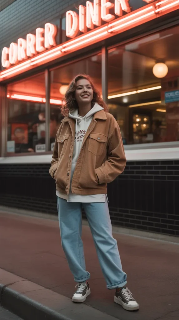 Channel retro warmth with a corduroy jacket, hoodie, relaxed jeans, and platform sneakers. It’s one of those warm winter outfits that feels nostalgic but current like your favorite ‘90s movie heroine come to life.