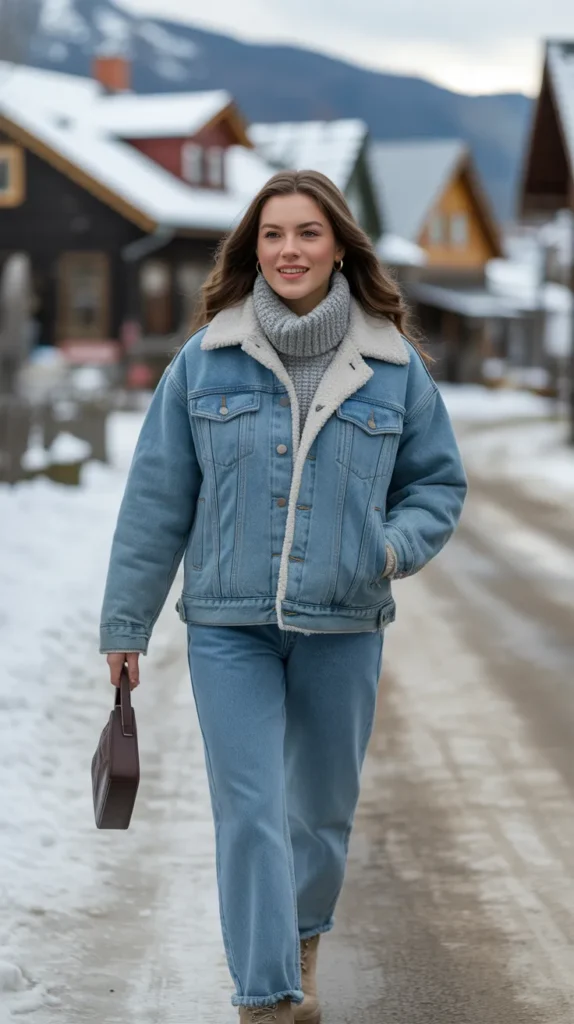 A shearling-lined denim jacket paired with a knit scarf, straight jeans, and boots gives instant cozy appeal. It’s a timeless casual outfit that feels like a warm hug but make it fashion.