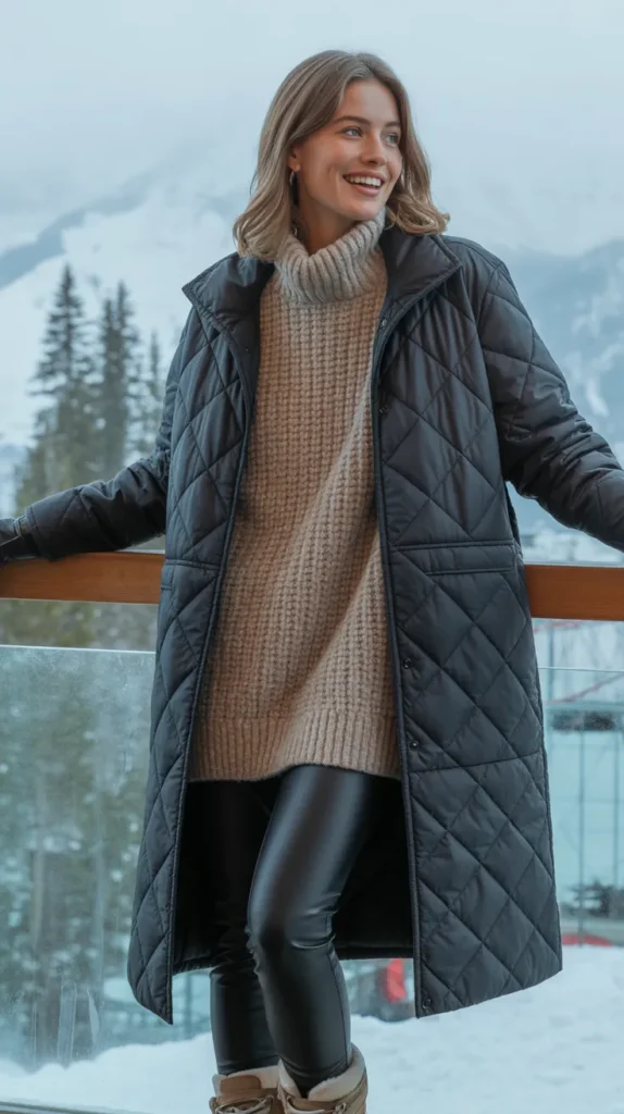 A quilted coat over an oversized sweater, leather leggings, and snow boots hits all the right notes for warm winter outfits. It’s equal parts sporty and sophisticated ideal for snowy adventures or chic coffee runs.