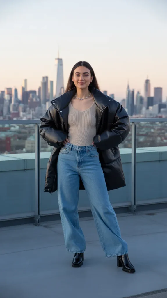 If confidence were an outfit, it would be this: a leather puffer, knit bodysuit, baggy jeans, and heeled boots. This cool girl winter outfit brings attitude and warmth in equal measure basically the definition of bold, cozy glam.