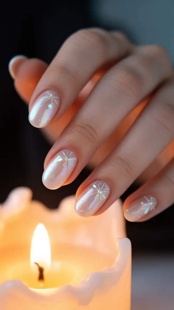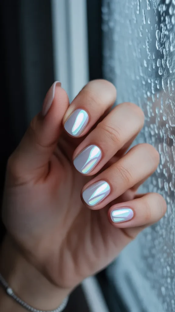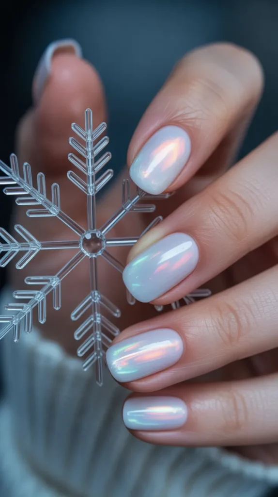 Icy opal white nails reflect light like frozen crystals. The pink and blue undertones bring that magical βfrosted glassβ effect that feels fresh and unique. These winter white nails glow softly in every light pure winter perfection. π