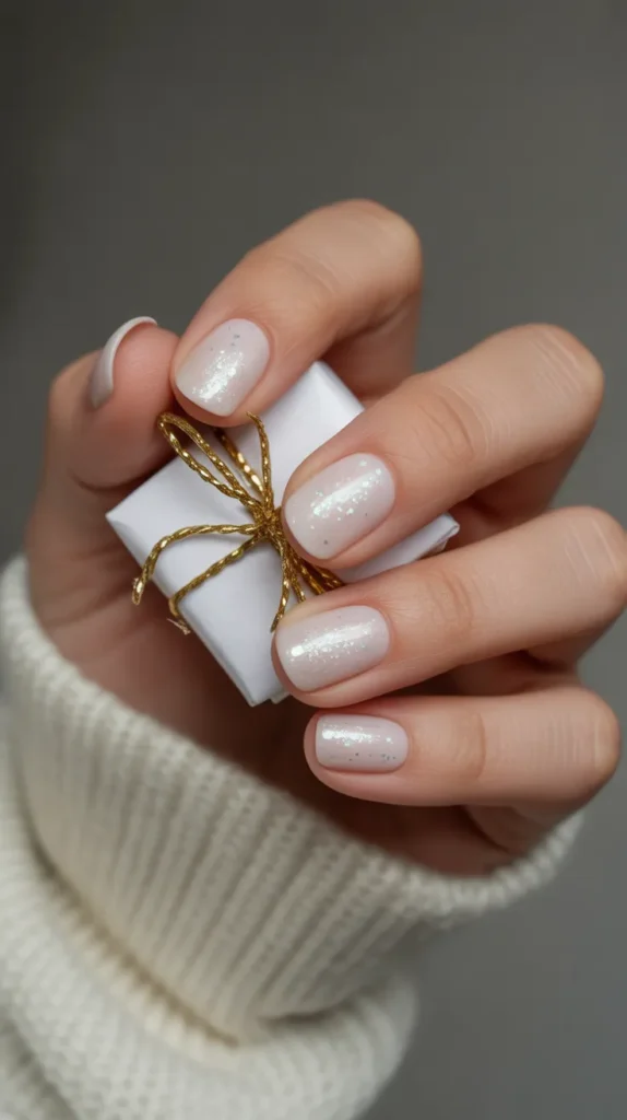 Short white glitter gel nails are practical yet glamorous. The compact shape keeps things neat, while the micro-glitter adds subtle December nails charm. A go-to for low-maintenance beauty lovers who still want that seasonal glow. π«