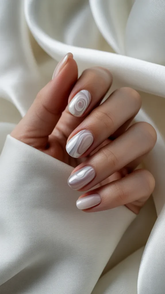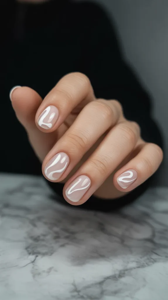 White swirl nails mix simplicity with artistic flair. The soft curved lines look fluid and modern, creating movement without clutter. These winter nails pair beautifully with any outfit cozy or chic.