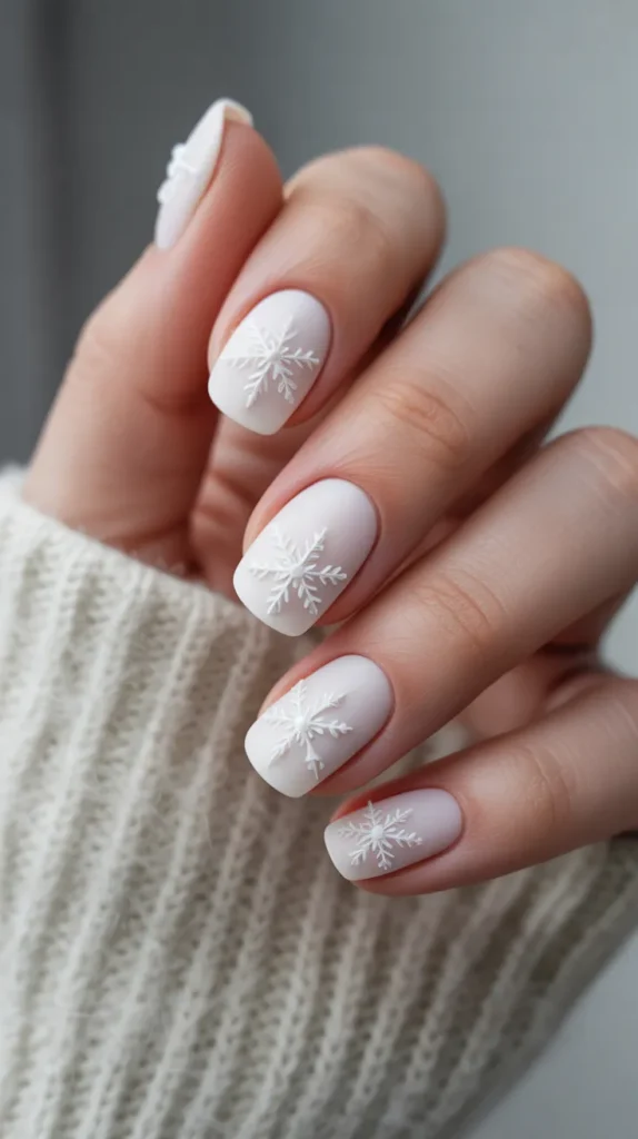 Matte snowflake nails are pure festive charm. The raised white snowflakes on a smooth matte base create texture while keeping things chic. Itβs the coziest xmas nails idea like wrapping your nails in a winter sweater. β