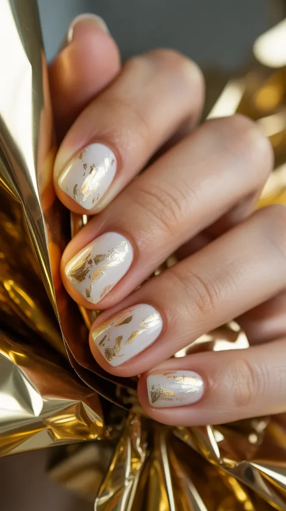 White and gold accent nails balance minimalism with luxury. The soft white base paired with fine gold flakes catches just enough light for a subtle sparkle. This winter nails design screams holiday chic. π