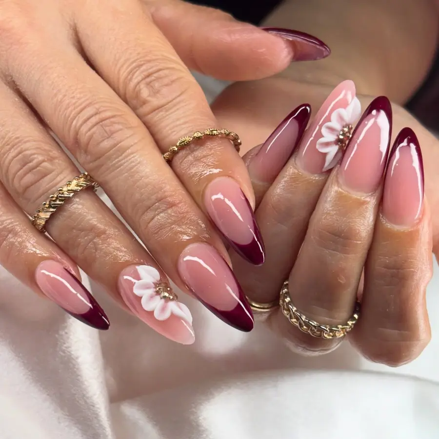 This manicure blends classic wine red nails with a soft nude base and delicate floral detailing. The deep red tips keep the look clean and polished, while the subtle flower accent adds a feminine, elegant touch. A perfect example of simple nails that still feel refined and thoughtfully styled.