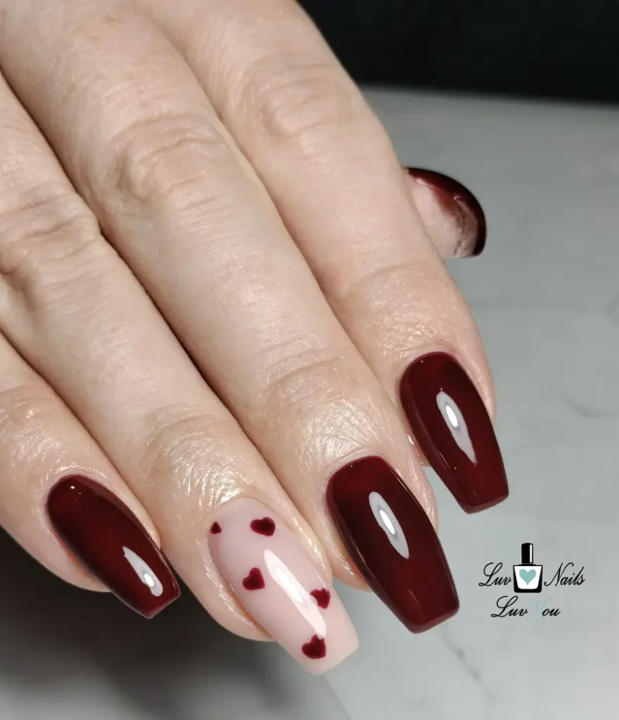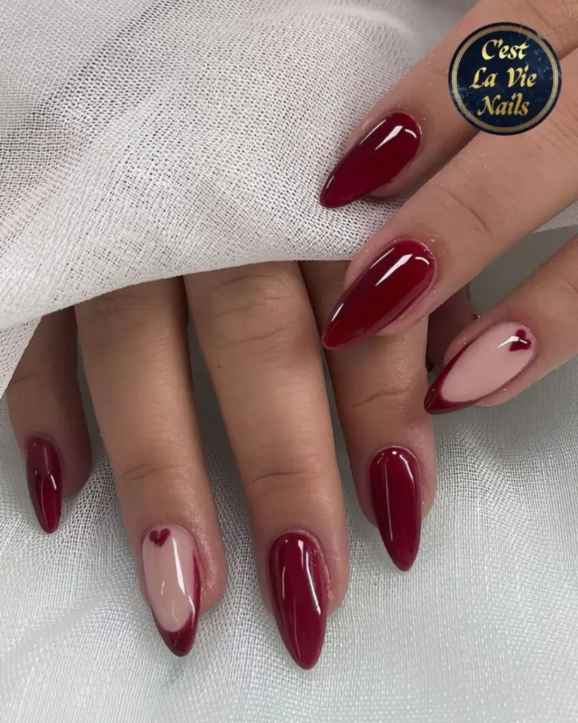 12. Classic Wine Red Almond Nails With Heart Accent