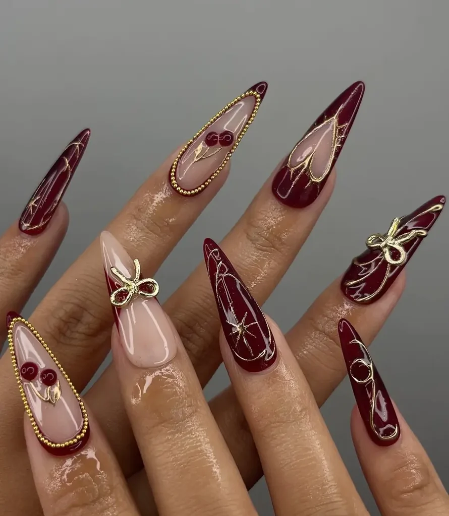 5. Wine Red Nails With Gold Bow Details and Elegant Accents
