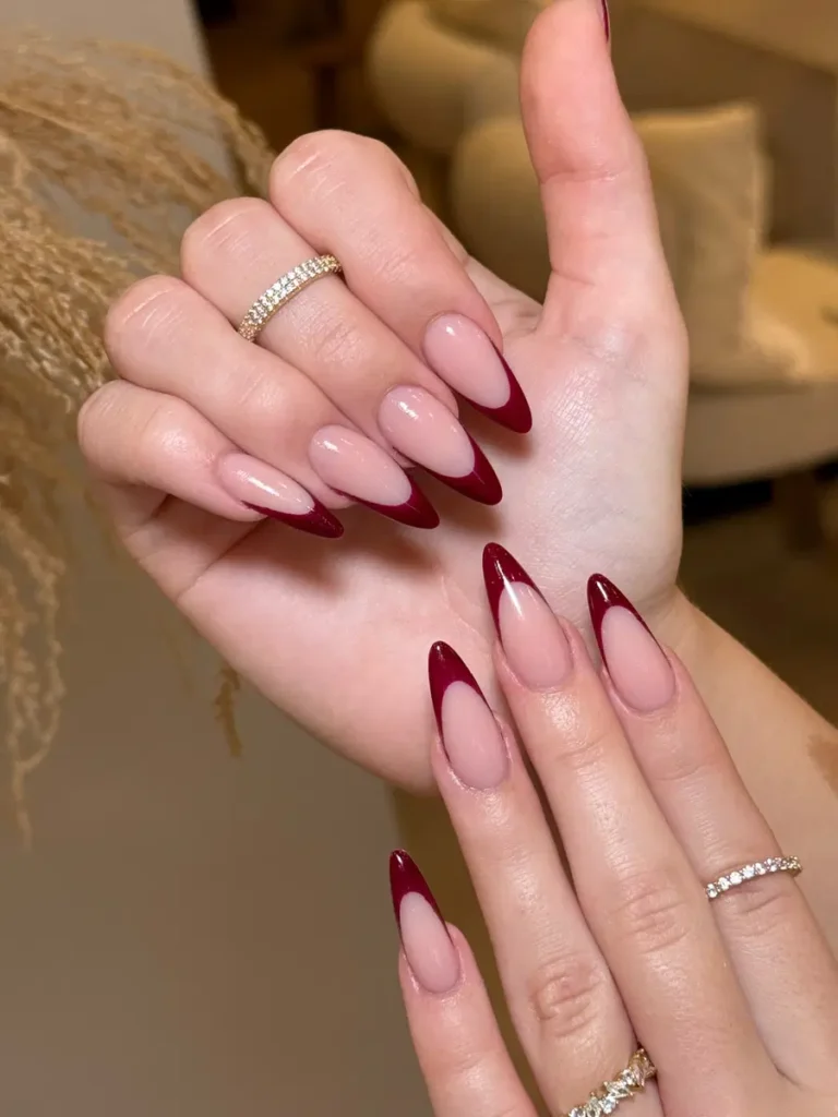 These wine red French tip nails feature a clean nude base paired with sharply defined, glossy red tips. The almond shape keeps the look elegant and wearable, making this style perfect for everyday polish with a refined edge. Simple, balanced, and effortlessly classy.