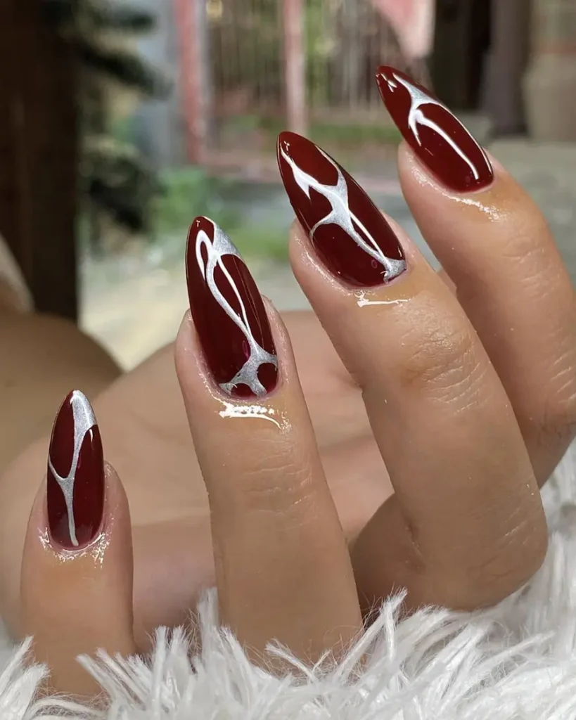 Bold wine red nails are elevated with fine silver abstract line work that adds contrast and movement. The glossy finish enhances the depth of the red, while the minimal design keeps everything clean and modern. A strong choice for dope nails that still feel refined.