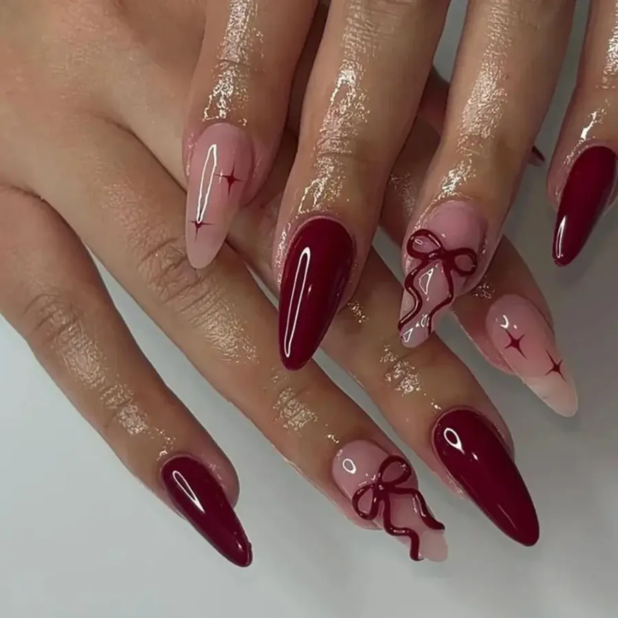 This manicure blends rich wine red nails with a soft blush base, elevated by delicate bow details and subtle star accents. The glossy finish keeps the look polished while the mix of solid color and playful details adds a dope yet refined edge to simple nails styling.