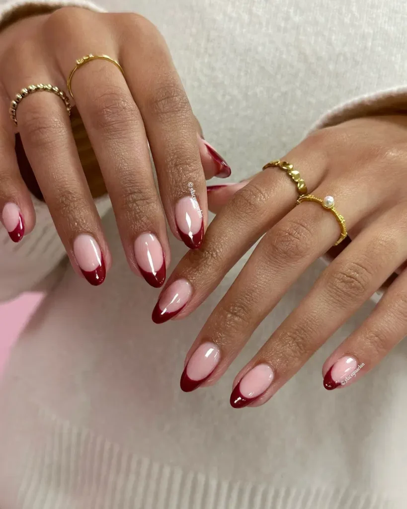 9. Glossy Wine Red French Tip Nails With Soft Nude Base