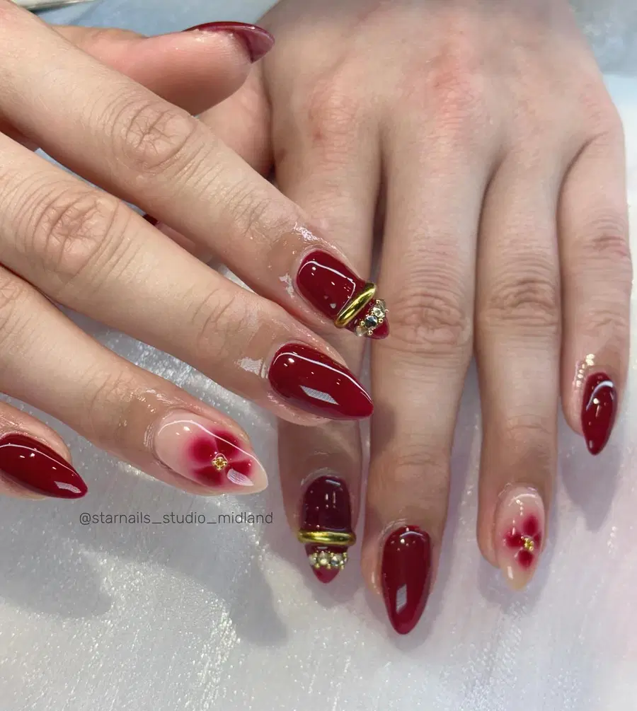 This manicure blends rich wine red polish with delicate floral accents on a sheer nude base. Subtle gold embellishments add a touch of luxury without overpowering the design. The overall look stays soft, feminine, and polished ideal for simple nails with artistic detail.